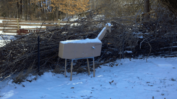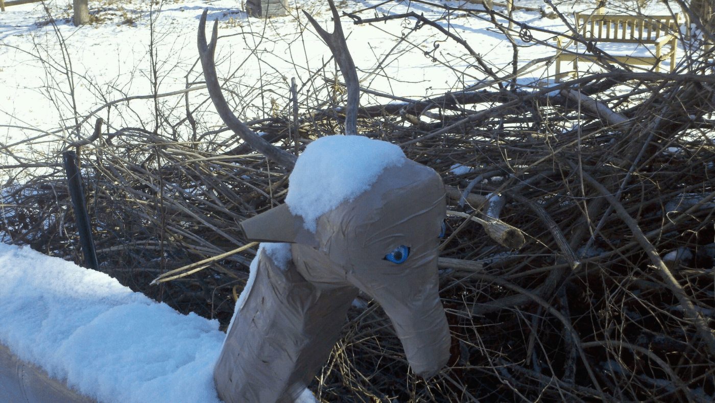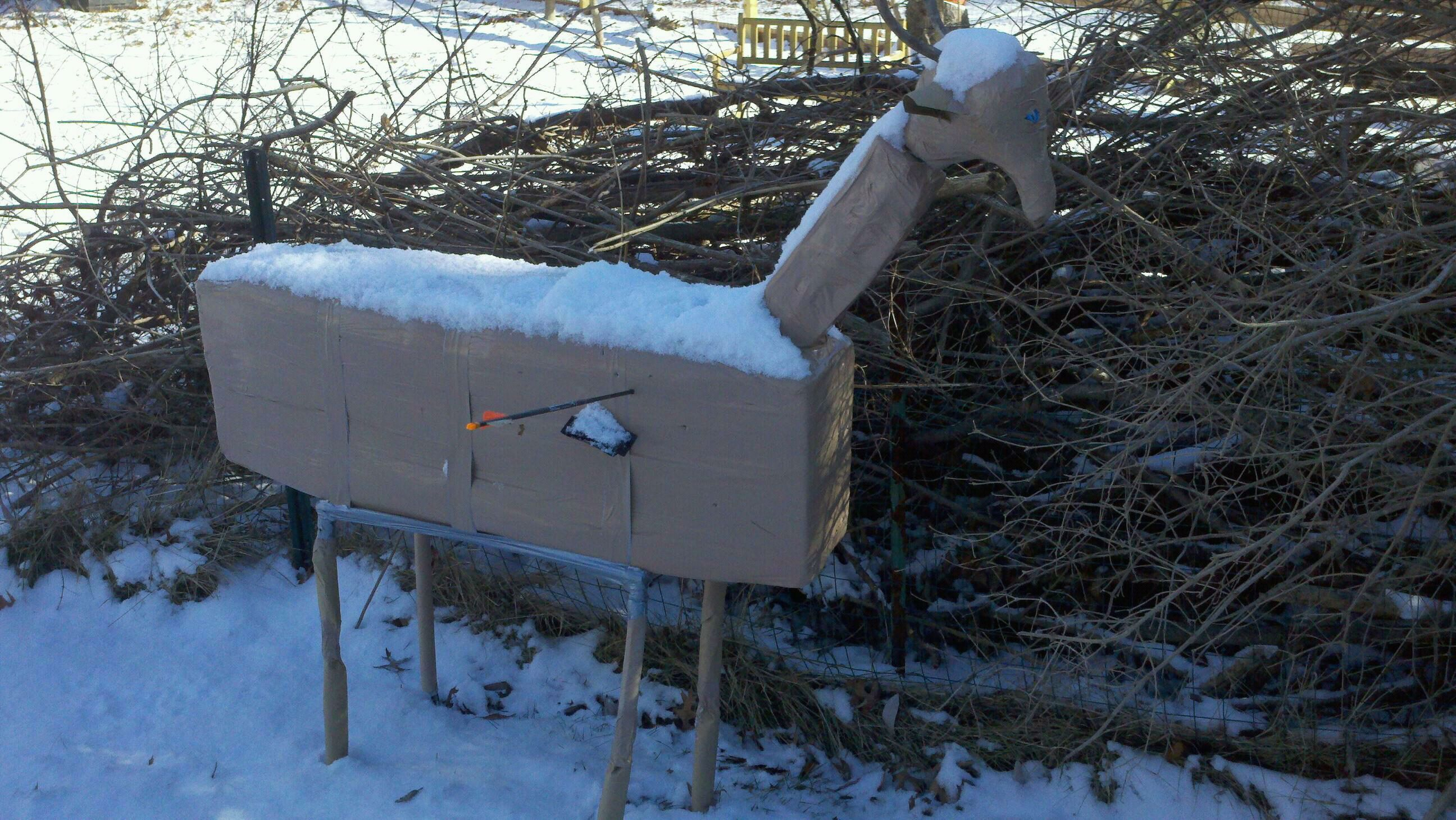 I did not want him to be disappointed that the only unemployed member of the family was his secret santa, so I decided to make one using $15 worth of materials from my workshop and Home Depot (insulating foam, deer colored duct tape, tent stakes, and a bike seat for the head.) Here is the completely functional, although cartoonish, result: