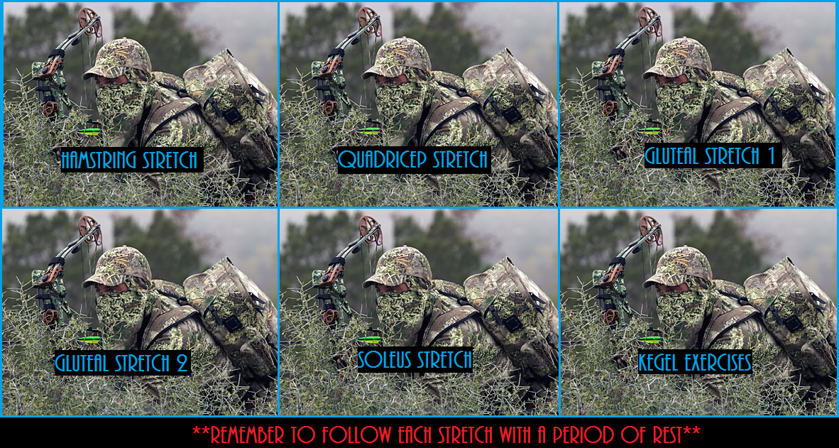 My next Good Idea came when I started getting intense leg cramps from sitting still for so long (once again to avoid moving and making noise.) The following pictures are from the new exercise book that I created exclusively for hunters. It includes stretches that can be done with minimal movement (including Kegel exercises, once thought to only be for pregnant women.)